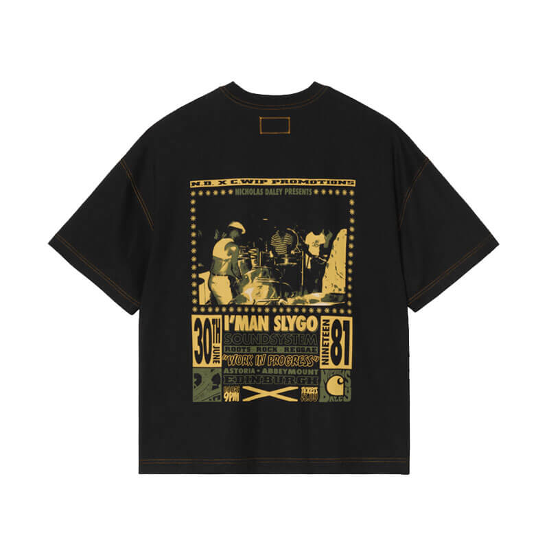 CARHARTT WIP x NICHOLAS DALEY Poster T-Shirt – Black: For Fall/Winter 2025, Carhartt WIP has collaborated with designer Nicholas Daley to create a collection focused on Daley’s core values of community, craftsmanship and culture, while nodding to his own Jamaican and Scottish heritage. The Carhartt WIP x Nicholas Daley Poster T-Shirt is made in a boxy loose fit from midweight cotton jersey. A large graphic print appears at the back, inspired by Daley’s parents’ ‘Reggae Klub’ nights in the late 70s. The item is also detailed with contrast stitching throughout. A co-branded Square Label appears on the chest.