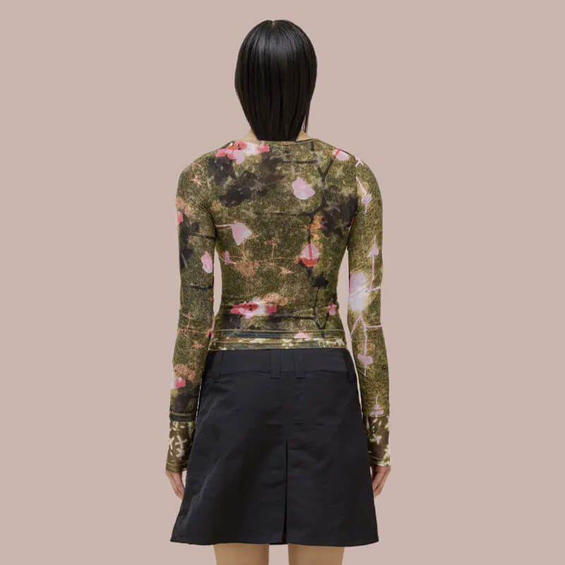 ECKHAUS LATTA Duet Top – Garden: Slim fit, long sleeve crew neck. Made of double layer digitally printed micromesh. Each layer has a distinct all over print, with the bottom layer peeking out from the hem of the top layer.