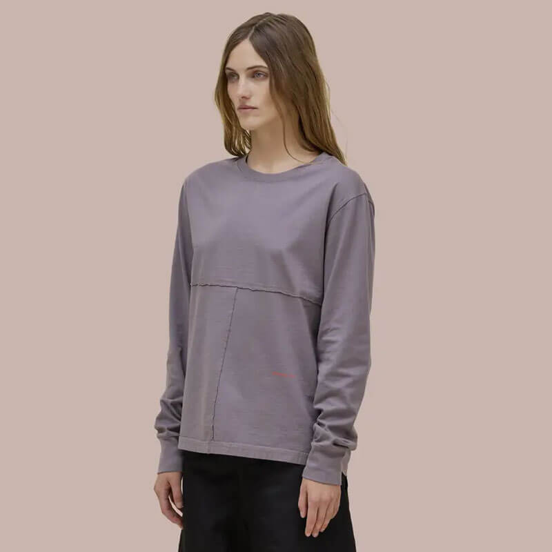 ECKHAUS LATTA Lapped Long Sleeve – Shark: Classic relaxed-fit lapped long sleeve in Pima cotton jersey with lapped raw-edged seams. Garment dyed in solid gray with olive green contrast topstitching. Finished with a screenprinted orange logo at the abdomen.