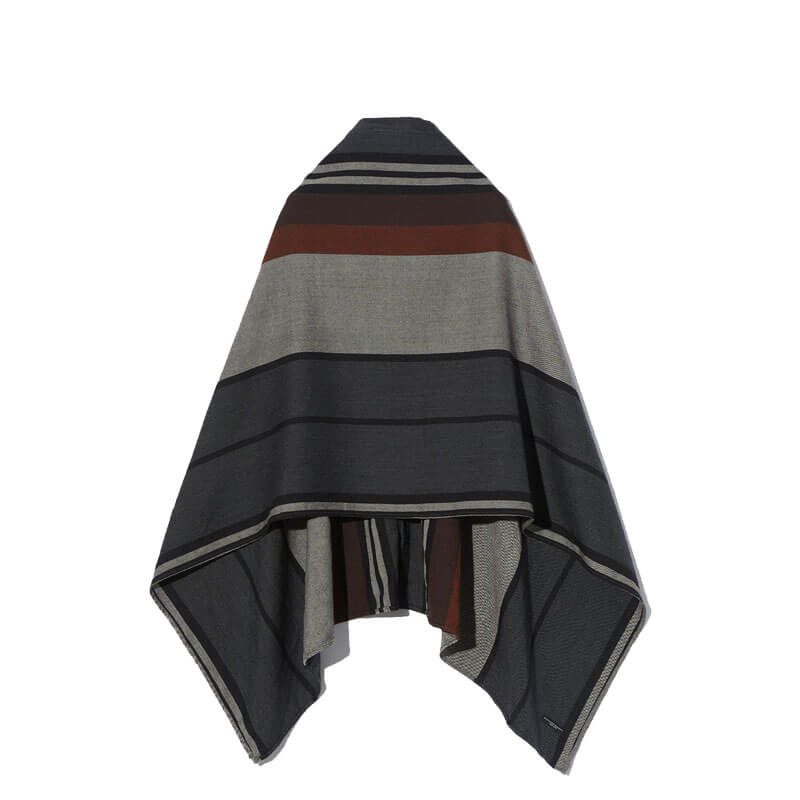 ENGINEERED GARMENTS Button Shawl – Multi Color Stripe: The Button Shawl is a multi-functional autumn piece. Its versatility allows for a variety of options: draped like a scarf, fastened at the front in a hood-like manner, or even draped casually over one shoulder for a touch of added warmth. This item is a signature piece in the collection, and makes for an effortless way to add contemporary style to any winter ensemble.