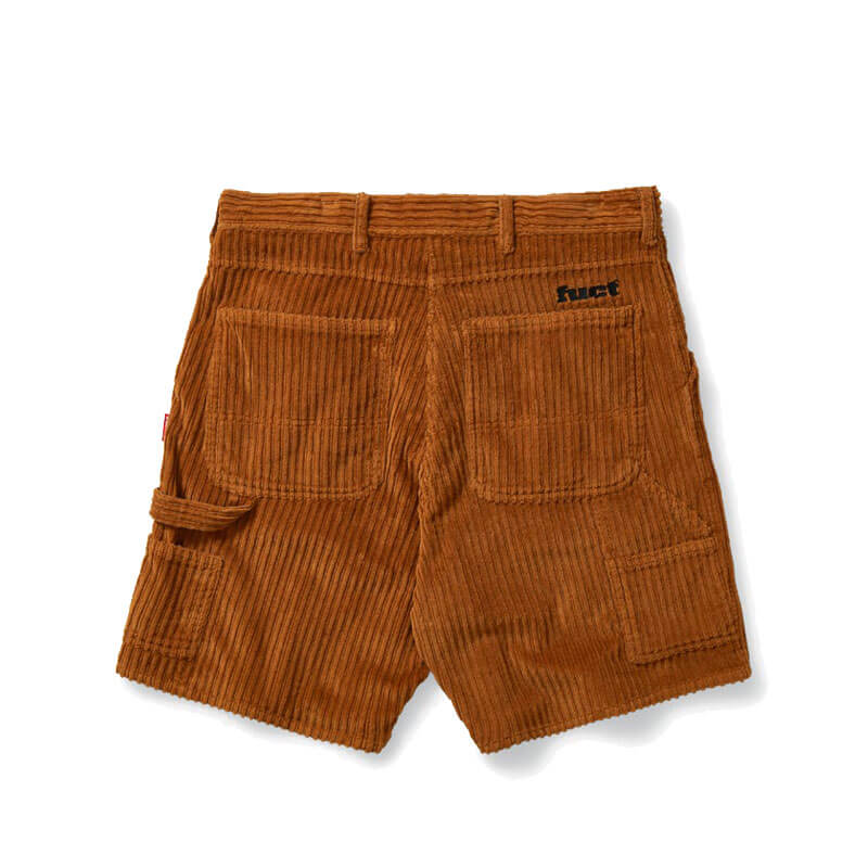 FUCT Carpenter Corduroy Short – Brown: Short pants made in wide wale corduroy fabric. Featuring Fuct embroidered logo over back pocket and red flag logo label. Oversized chino short made in a poly/cotton blend. Crafted in Italy, this short pant features a western yoke back pockets.