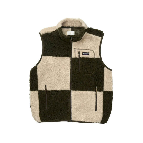 Included in the last Fall24 delivery, the GRAMICCI Checkered Sherpa Vest – Natural / Olive features: