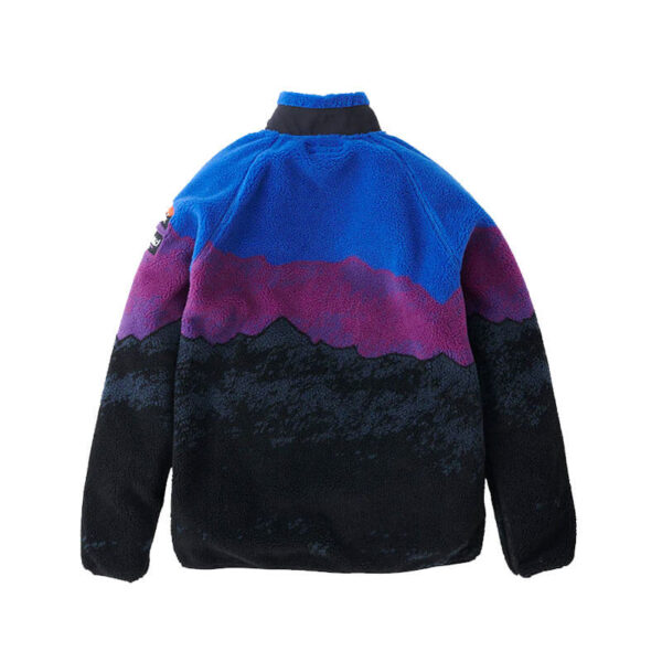 GRAMICCI x NANGA Ridgeline Fleece Blouson – Multi: High-collared sweatshirt featuring a tru-color pattern that resembles mountain peaks. Knit tape is used for hem and sleeve openings and high-density taffeta is used for the collar. This fuzzy sweater is a staple for a stylish urban wardrobe. The materials and stitching are noticeably high-quality, and wearing this will keep you warm and cozy while exploring the city on foot or relaxing in a coffee shop.