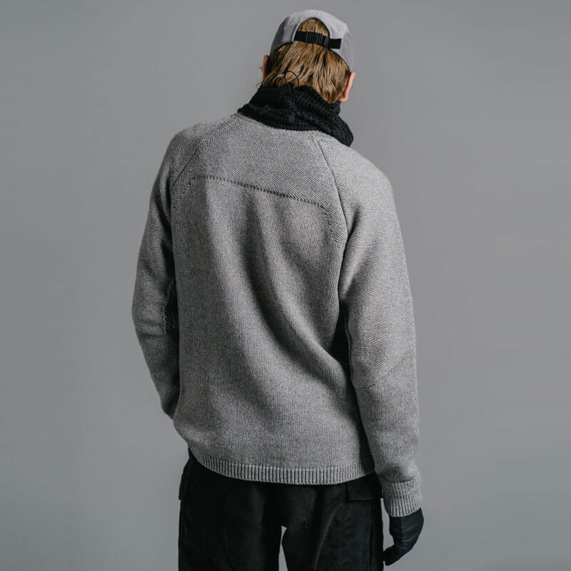 HAVEN Harbour Sweater – Heather Grey: The Harbour Crewneck is reinvented for Fall season, utilising a soft, smooth and durable cotton cashmere blend. Crafted with an exclusive purl and jersey stitch, this timeless sweater retains it’s dimensional appearance and structural integrity. Held together through its panelled construction created by utilising various knit types. The mesh stitch underarm acts as ventilation while a dual gauge knit at collar and cuff adds further reinforcement and detail. A classic yet intriguing piece that will stand the test of time.