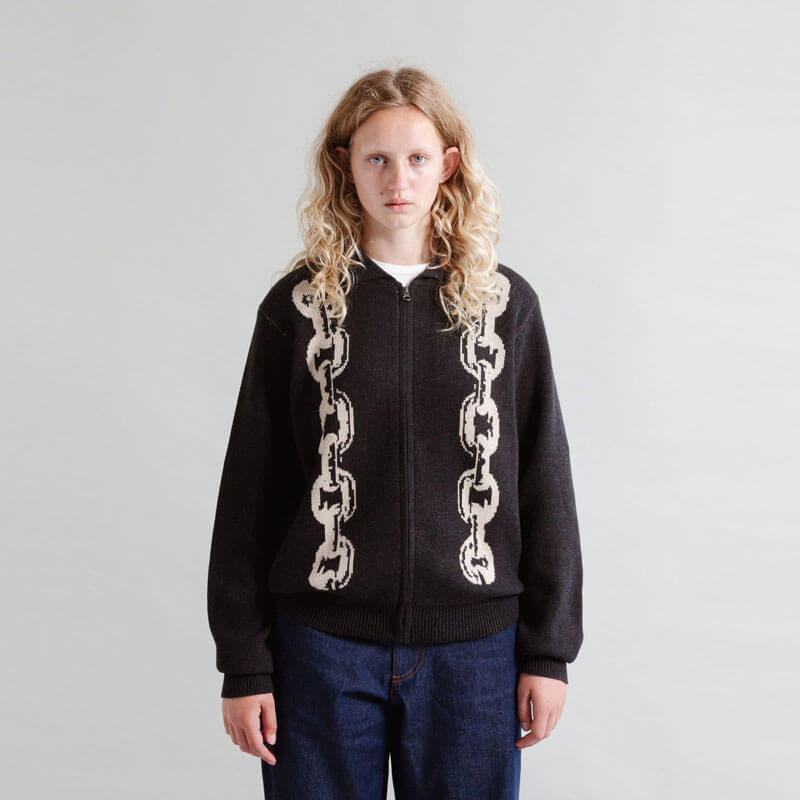 HERESY Chain Knit Shirt – Charcoal: Jacquard knitted zip shirt in charcoal cotton yarn, featuring ‘Chain’ graphic on the front and YKK zip.