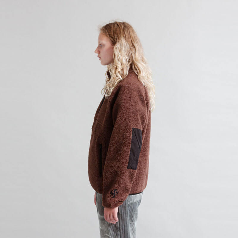 HERESY Cultivator Pullover – Brown: Funnel neck 1/4 zip fleece in sherpa fleece. Featuring ‘Portal’ embroider on the sleeve, zip pockets in the body and black cotton placket, and elbow patches. The fleece is made out of 100% polyester outer and comes in an oversized fit.