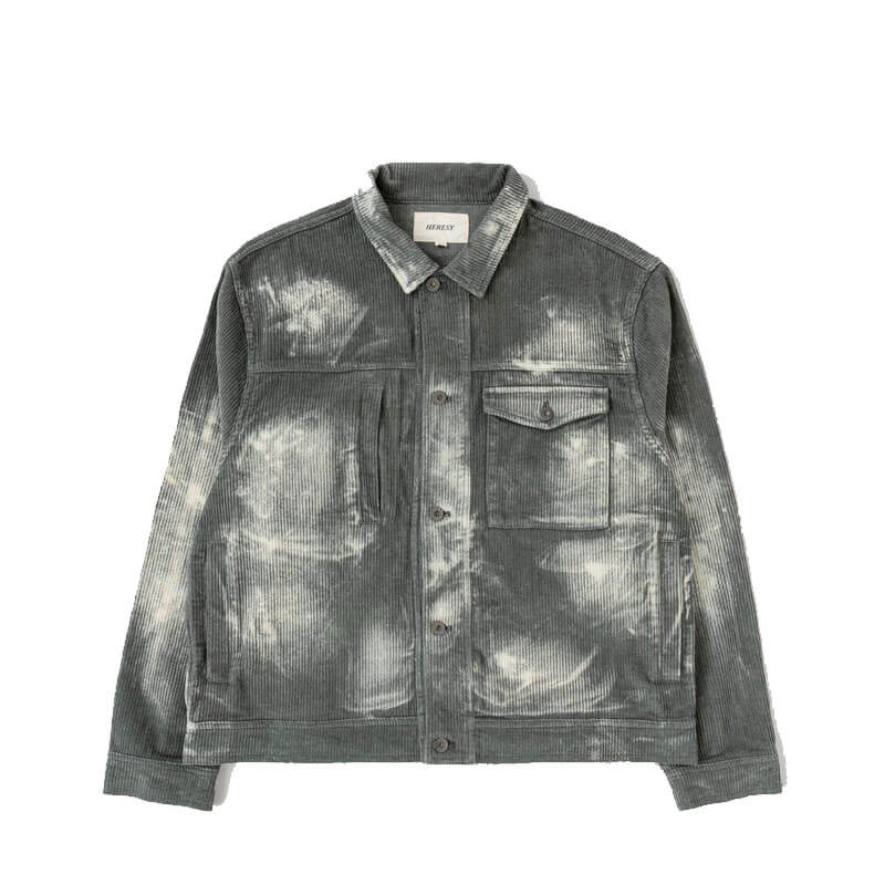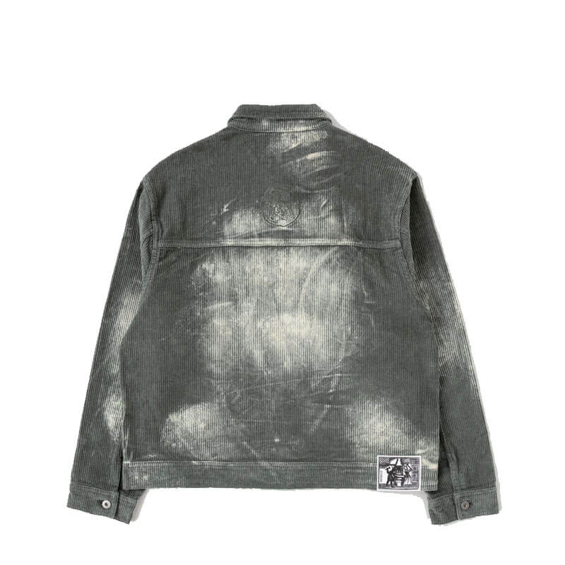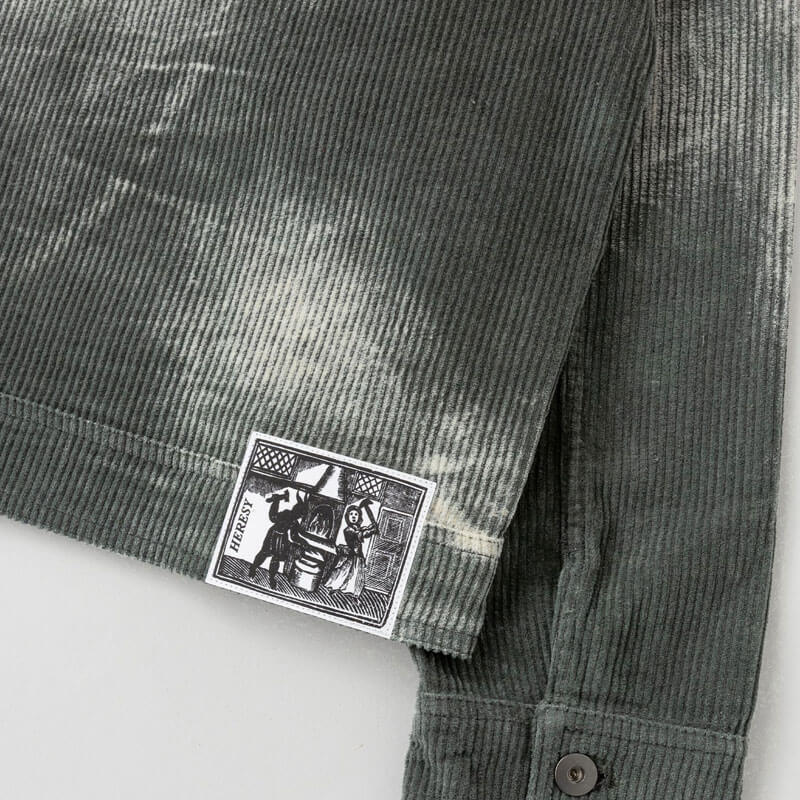 HERESY Pond Jacket – Green: Trucker jacket in bleach washed cotton cord, featuring ‘Rambler’ embroidery on the back yoke and welt pockets. The jacket has YKK jeans buttons and jacron paper patch on the back. Due to the nature of the washing each piece will be slightly different.