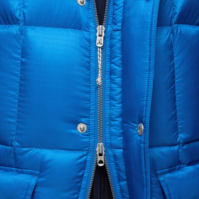 MAMMUT x NIGEL CABOURN Direttissima IN Hooded Jacket – Valley Blue: This heritage jacket was created in collaboration with the British cult designer Nigel Cabourn. Inspired by the 1969 first ascent of the Japanese Direttissima route on the Eiger, the design is based on an original puffer from the period. The outer shell is crafted from durable Pertex® Quantum fabric – a lighter, modern version of the original downproof fabric used for expedition clothing. The vintage look is complemented by an embroidered Mammut Garantie logo, two patch flap pockets and a fleece-lined side entry pocket.Â