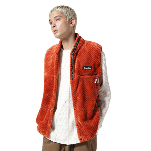 MANASTASH Thermal Fleece Vest – Rust: Classic 90’s style vest made from thermal-like Jacquard fleece fabric, which is lightweight and provides extra warmth on cool nights or during outdoor adventures. Simple style but very detail oriented; diagonal smartphone pockets on both sides, and the side zippers for ventilation and for easy put on/take off. Included in FW22 Manastash’s collection, this Thermal Fleece Vest features: