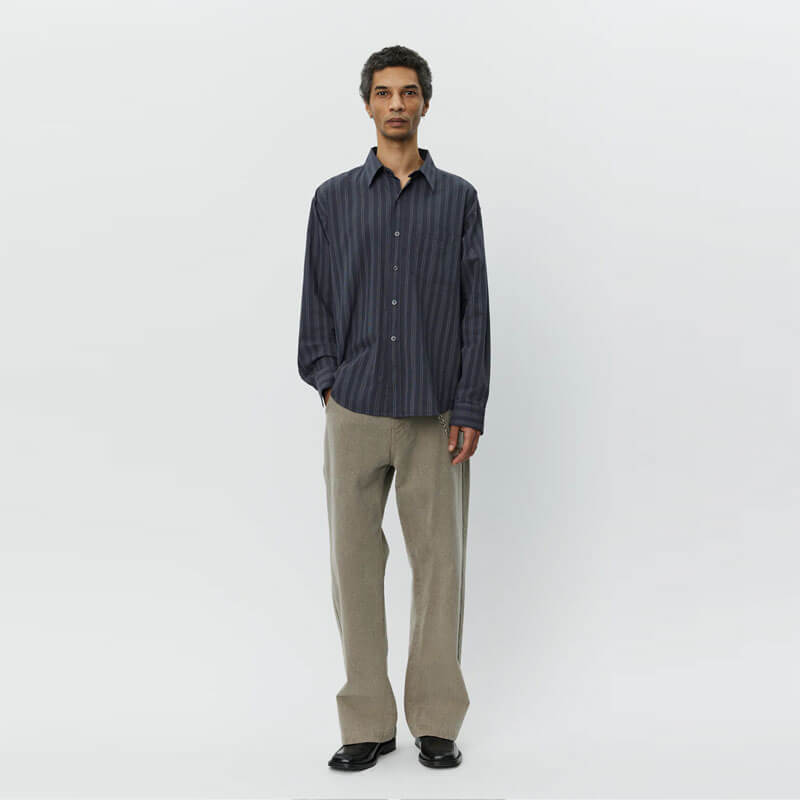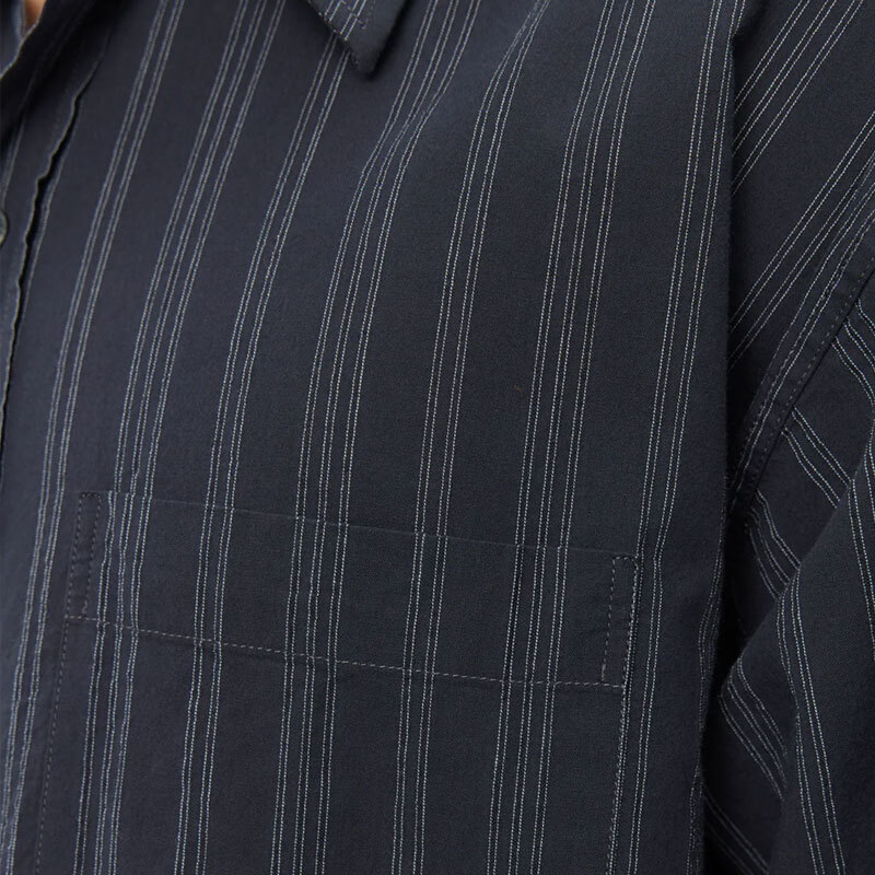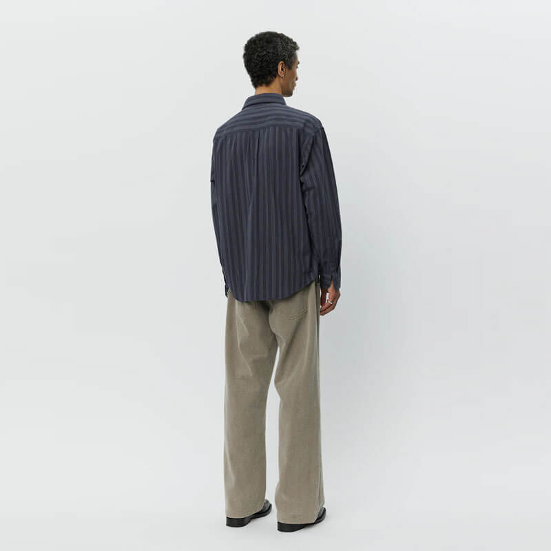 MFPEN Executive Shirt – Dark Grey Double Stripe: The Executive Shirt has a relaxed fit with drop shoulders and a rounded hem. Featuring a button placket, spread collar, back yoke pleats and a chest pocket. Cut from a smooth, lightweight cotton in a white multi stripe on a dark grey ground.