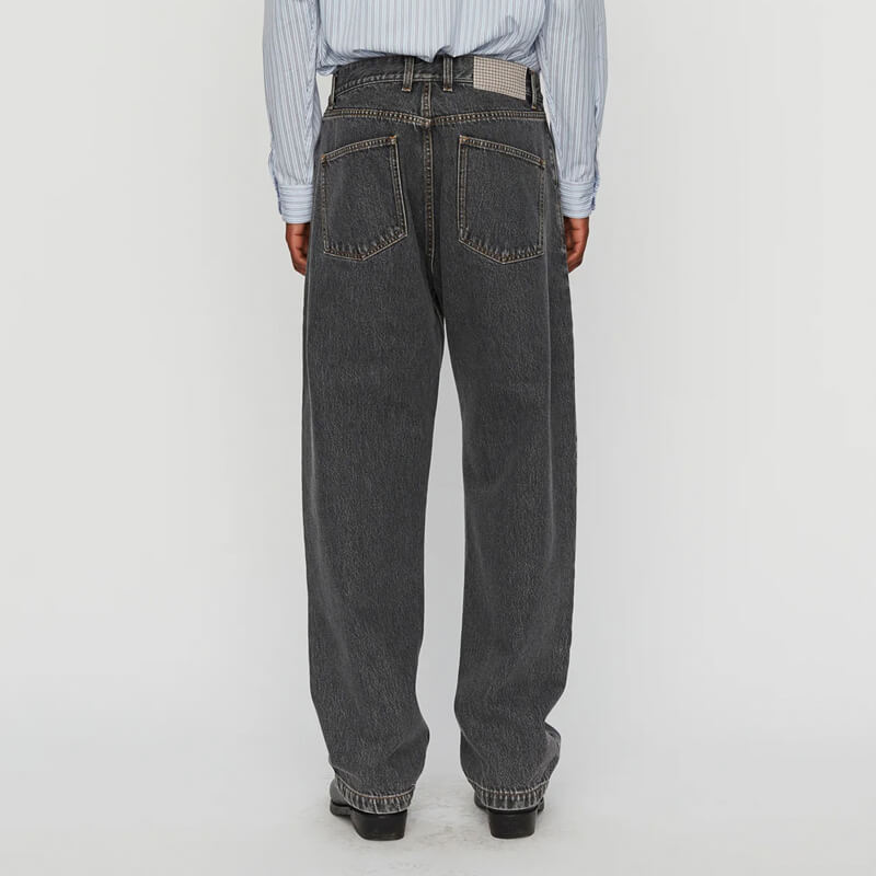 MFPEN Regular Jeans – Grey: Regular fitted jeans in a washed blue in a rinsed 13-ounce Italian organic cotton. With two side pockets and back patch pockets. Button closure and YKK zip fly. Label detail in checked fabric on the waistband.