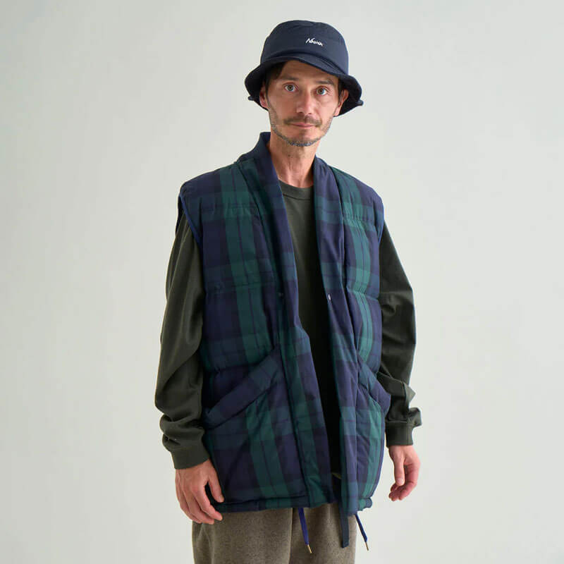 NANGA Cotton Peach Down Hanten Vest – Black: This hanten vest offers lightweight warmth and versatility for both indoor comfort and light outdoor use. Made from ultra-soft micro-peach cotton fabric, it provides a cozy feel, while the ribbed neck enhances comfort with a snug fit. The vest’s loose silhouette allows layering over thicker clothes, and it features snap buttons and a tie for customizable wear. A large waist pocket provides storage for essentials and doubles as a hand warmer. With its simple, modern design, this vest is perfect for staying warm at home or on casual outings.