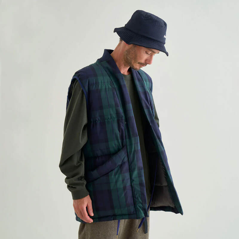 Included in the last delivery of the Japanese brand, this NANGA Cotton Peach Down Hanten Vest – Black features: