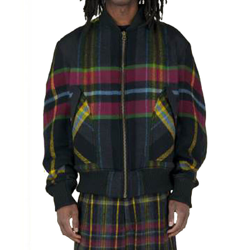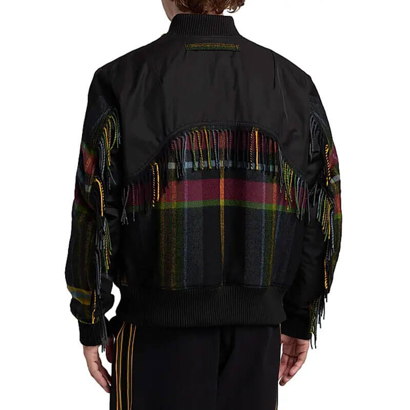 NICHOLAS DALEY Blanket Bomber Jacket – Night Tartan Black: Bomber jacket made in UK from seasonal Nicholas Daley registered tartan. This garment showcases a blanket-inspired design that nods to Daley’s Scottish upbringing. Features hand-finished blanket fringing, celebrating the brand’s dedication to traditional craftsmanship and artisanal heritage.