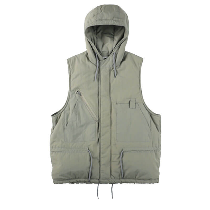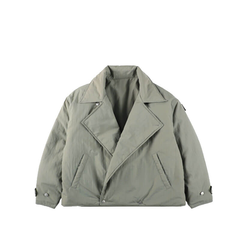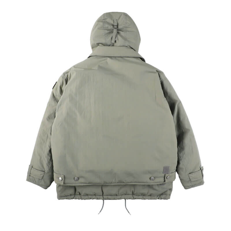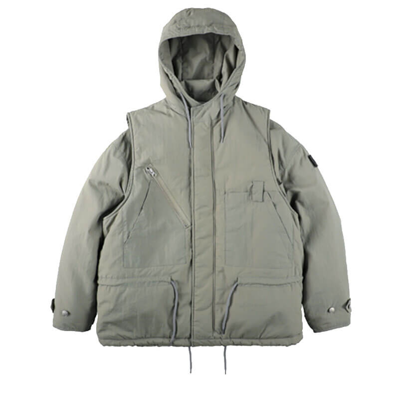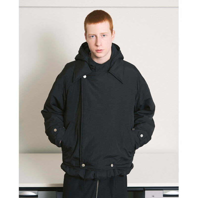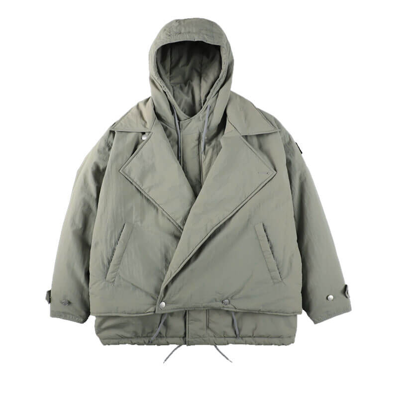 PHINGERIN Double Cushy Hooded Jacket – Grey: Â An original puffer double short coat featuring a layered style of a vest and a jacket, made with a soft wrinkled nylon that has an organic texture. The inner vest layer has a slightly longer length than the outer jacket layer, creating a voluminous and luxurious puffer jacket when worn together. Inner snap buttons ensure both vest and jacket stay together. Can also be worn separately out layered in reverse for different styling options. The deep overlapping lapels allow for a double-breasted silhouette similar to a pea coat. From the outside, only the tuck buttons at the hem are visible, creating a clean contrast against the intricate design.