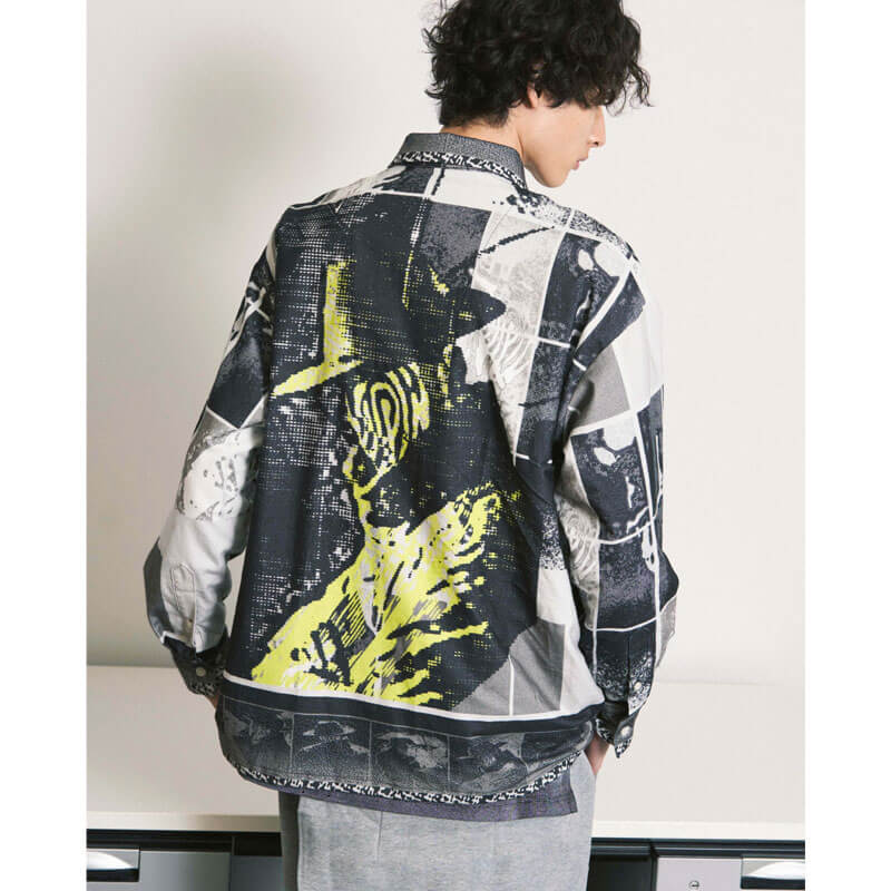 PHINGERIN Flannel Open Collar Shirt – Agent: A touch of yellow stands out against the monotone, and this artistic graphic print flannel shirt features fragments of scenery laid out in a pattern.