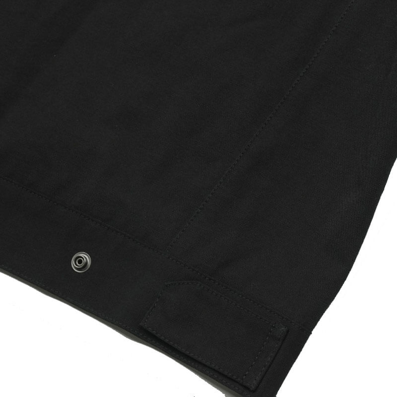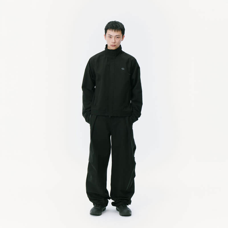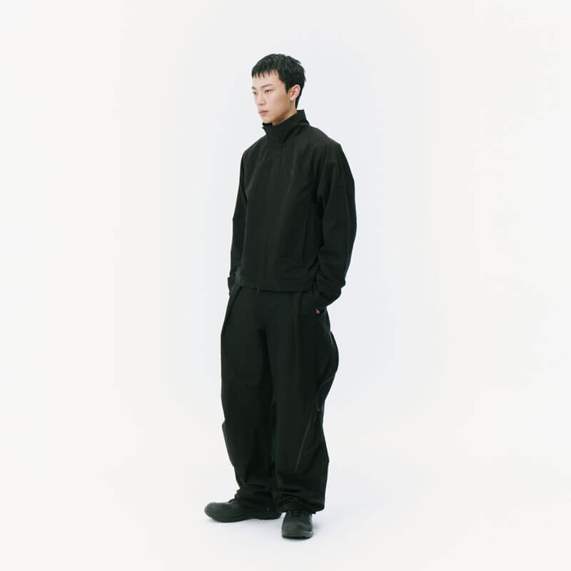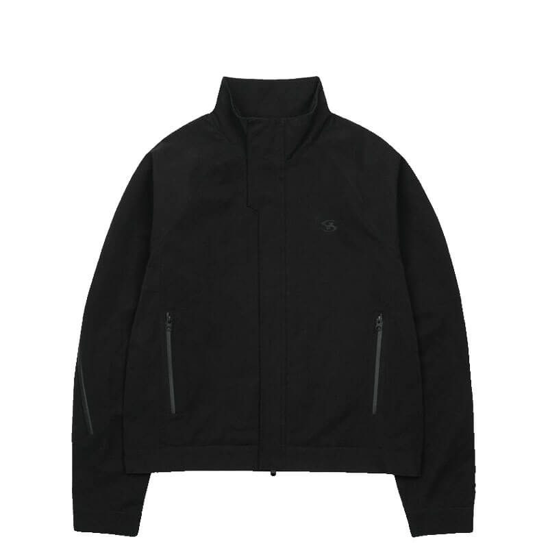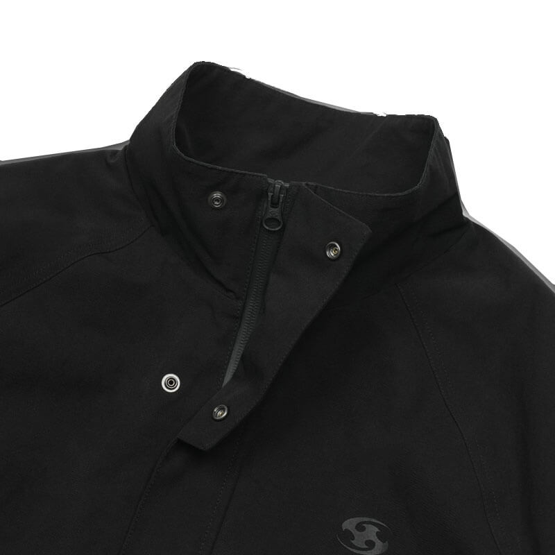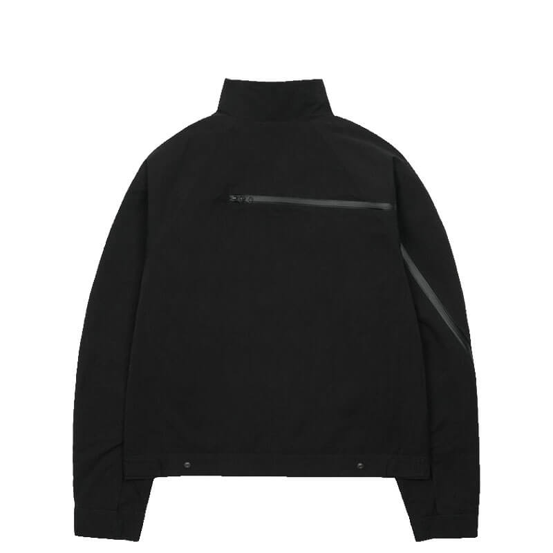 SAN SAN GEAR Affine Curve Jacket – Black: Full zippered closure jacket with adjustable silhouette via asymmetric zipper front sleeve to back. Crafted in a cotton-nylon blend fabric, stand-up collar and front pockets complete the design.