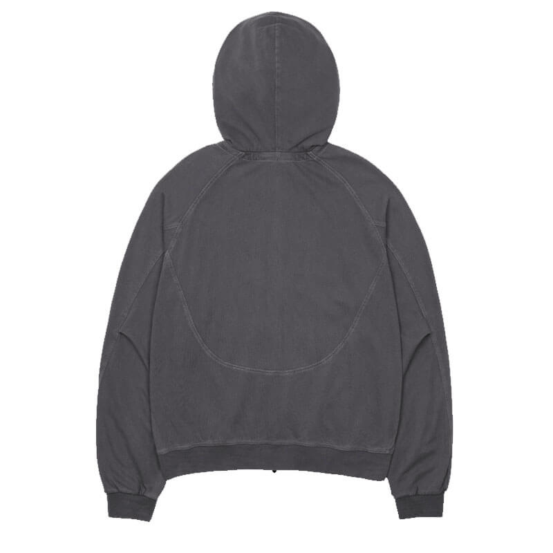 SAN SAN GEAR Washed Hoodie Zip-Up – Charcoal: Hooded sweatshirt with full zippered closure. Crafted in a cotton material with pigmented dyed and washed finishing, is a thin and flowy fabric that allow creates a relaxed and draped silhouette.