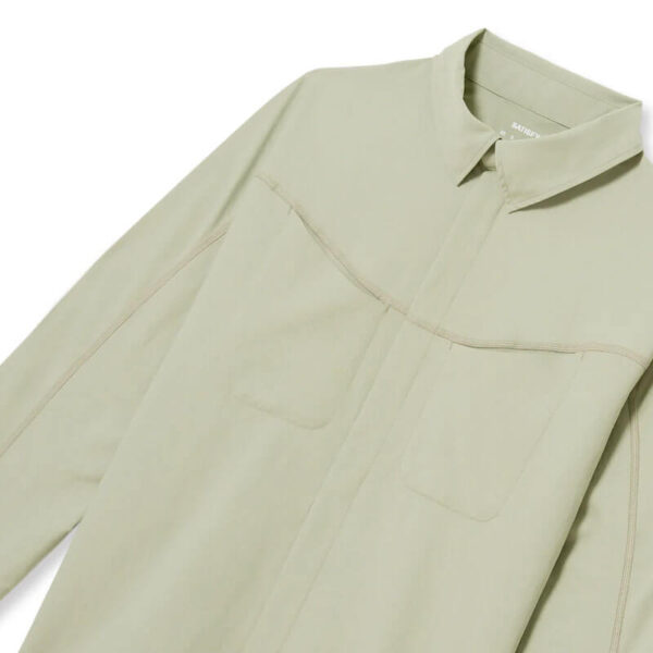 SATISFY® PeaceShell™ River Shirt – Tea: Lightweight PeaceShell™ River Shirt is a shirt for the trails. Engineered with ice pockets on the back for mid-race cooling. Constructed from lightweight and fast-drying PeaceShell™ recycled micro twill from Japan.