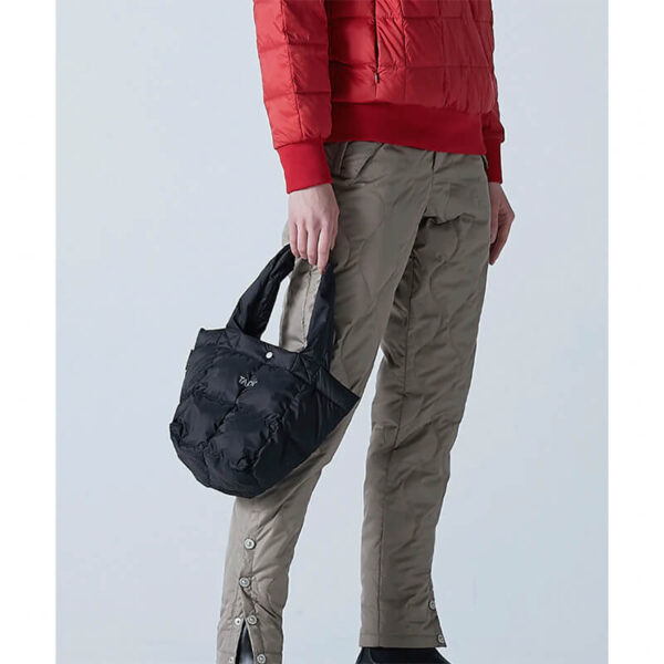TAION Lunch Down Tote S – Beige: Down-filled fabrics are paramount to TAION’s designs, with pieces like this Tote Bag synonymous to the Japanese label. It’s crafted using the usual water repellent, light, soft, fluffy and voluminous feel that is unique to down, then accented with a color scheme of the TAION logo print.