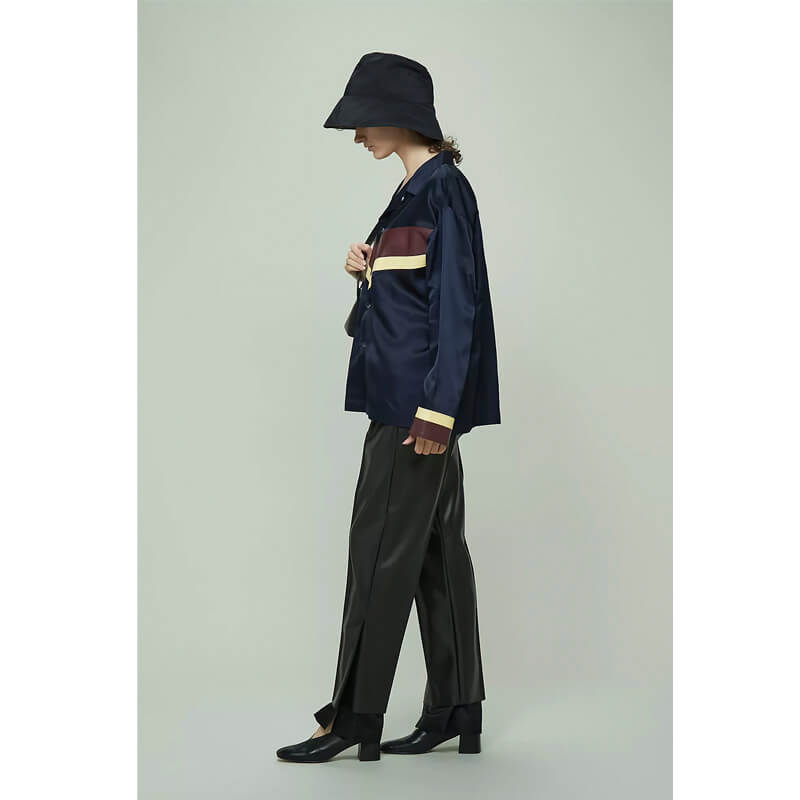 TOGA ARCHIVES Cupra Fake Leather Shirt – Navy: A military-style open-collar shirt made from soft and supple cupra fabric. The use of two colors stripe leather is an eye-catching accent, and an impressive style is completed immediately. The oversize silhouette makes it easy to put on, making it perfect for light outerwear during the changing seasons. Included in Toga Pulla’s FW22 collection, this Cupra Fake Leather Shirt features: