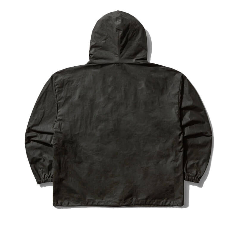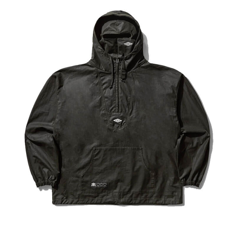 UMBRO Smock Waxed Anorak – Dark Olive: Boxy fit hooded jacket with waxed finish, where Italian retailer Slam Jam tying together Umbro’s affiliations in football and subculture, bringing an unconventional edge to Umbro’s casual styles through a contrast of formal tradition and urban grit.