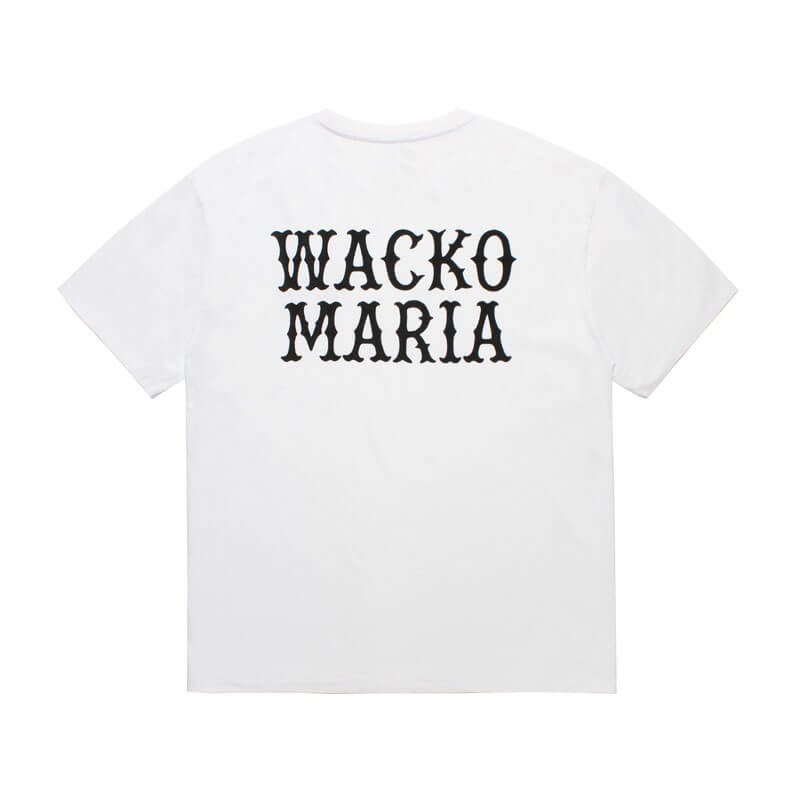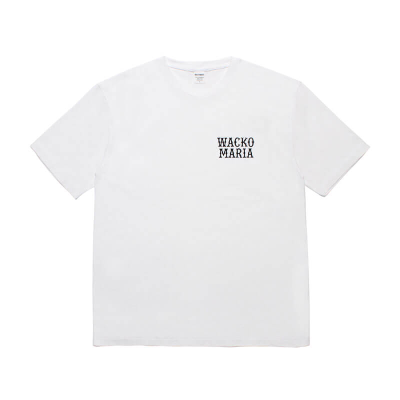 WACKO MARIA Wacko Heavyweight Tee – White: Heavy weight short sleeve tee with graphic logo embroidered on chest and graphic printed on back. Pre-washed garment to avoid shrink.