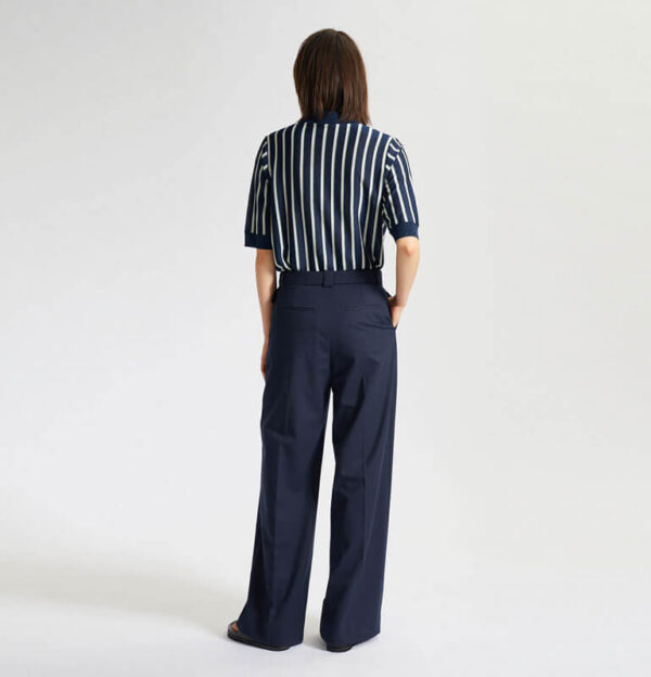 WOOD WOOD Janine Metalic Stripe Polo – Navy:Â Short sleeve polo developed with metallic yarn to receive a high sheen. Featuring a slightly oversized fit, this polo includes a wide half placket and ribbed hem and cuffs. Certified organic shell buttons add extra detail. Included in WW’s Spring 22 collection, this knit top features: