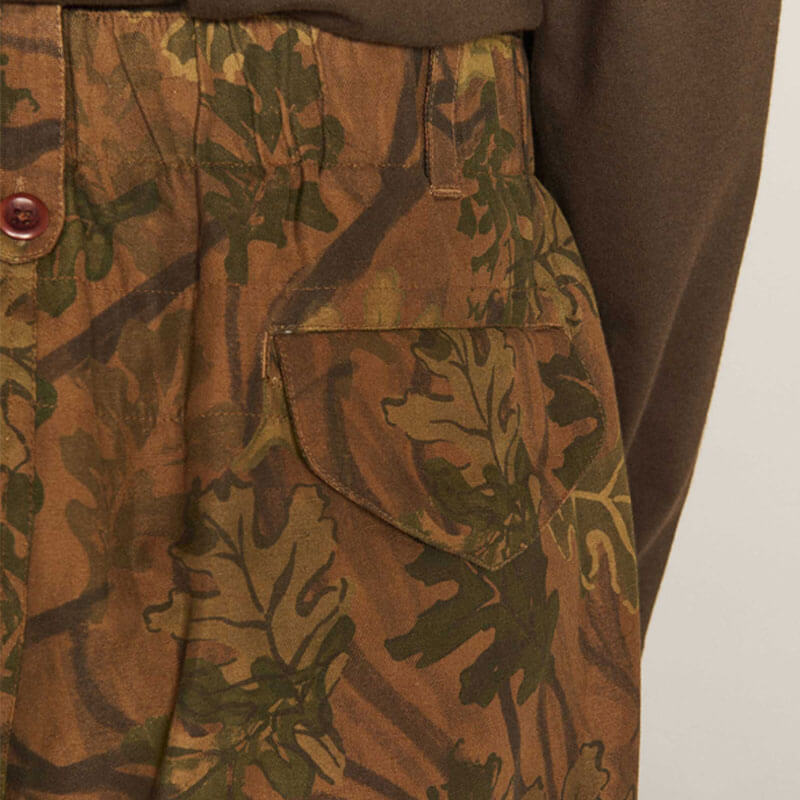 YMC Military Trouser – Brown Multi: Relaxed fit trouser with an all-over leaf print camouflage that nods to its military influence. Finished with utilitarian detailing including a leg patch pocket and drawstring waist. Crafted in cotton twill and included in the last FW23 collection, this YMC Military Trouser – Brown Multi features: